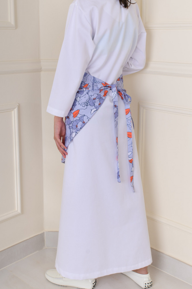 - التفاصيل: بياقات مزينة بنقوش زرقاء متقنة، ومريلة بنفس التصميم، تحتوي على جيب واسع لإضافة لمسة من العملية.