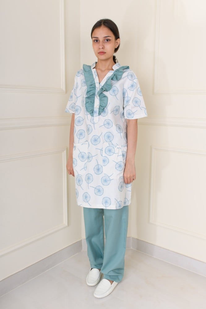 - التصميم: بلوزة طويلة، مصممة لتناسب العاملات المسلمات، مزودة بجيوب عملية لتوفير الراحة والوظيفية.