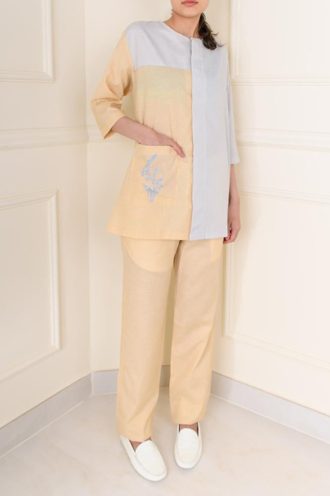 - تصميم: سترة طويلة مع أكمام 3/4 وبنطلون متناسق
